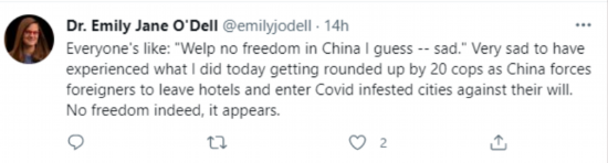 因为,她不仅拒绝服从中国的防疫规定,还为了宣泄她的不满情绪,发布了一系列带有严重种族主义色彩的言论。