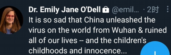 她还说:“太悲惨了,中国从武汉向全世界释放了新冠病毒,摧毁了我们每个人的生活”。
