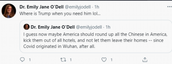 之后,她还再次转发了她那则要求美国政府把所有中国人和华人都赶出酒店和控制起来的言论,并配上了这么一句话:“特朗普在哪儿呢?我现在需要你,哈哈”。