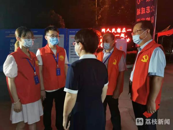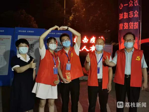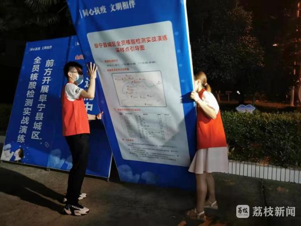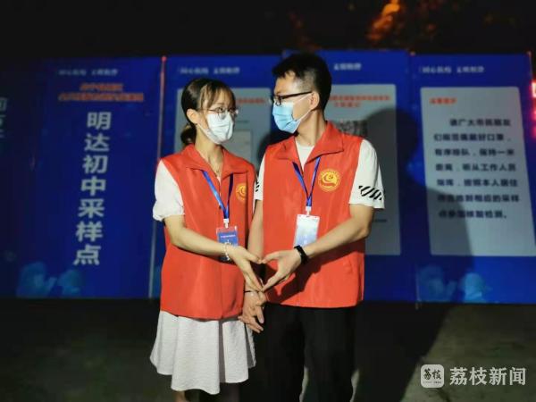 记者了解到, 周成成和储广萍都是阜宁县明达初中的教师,两人在学校里就是一对让人羡慕的情侣。放暑假后,两人一直住在盐城市区。最近,他们得知阜宁全县进行全员核酸检测实战演练,急需服务的志愿者,两人一合计,第一时间回到学校报名 " 应战 "。 维护现场秩序、协助登记信息、宣传防疫知识、帮助搬运物资 …… 周成成和储广萍身着红色马甲,起早贪黑,为前来做核酸检测采样的居民登记信息,核对身份证、询问电话号码和住址、告知采样前后的注意事项,各个环节都一丝不苟,为现场市民提供贴心服务。