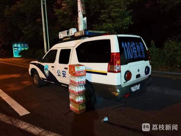 照片显示:一辆警车旁堆放着四箱矿泉水和一箱泡面。据了解,当晚正在查验点执勤的费晓斌,发现一辆车行驶到警车附近,车上突然下来一个年轻男子,迅速地“扔”了四箱矿泉水和一箱泡面在警车旁,并大声喊“你们辛苦了”,随后就“溜”了。