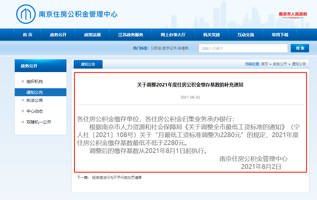 今年8月1日,南京市人力资源和社会保障局发文,自2021年8月1日起调整全市月最低工资标准为2280元,这也使得南京公积金的每月最低缴存额有了说法。南京公积金中心于今年6月25日宣布调整公积金缴存基数,2021年度的缴存基数为2020年度职工个人月平均工资,最高不超过南京市统计局公布的2020年在岗职工月人均工资的3倍(34500元),最低不低于南京市2021年职工最低工资标准,由于当时这一标准尚未公布,南京公积金中心表示,每月最低缴存基数待相关部门公布后另行通知。