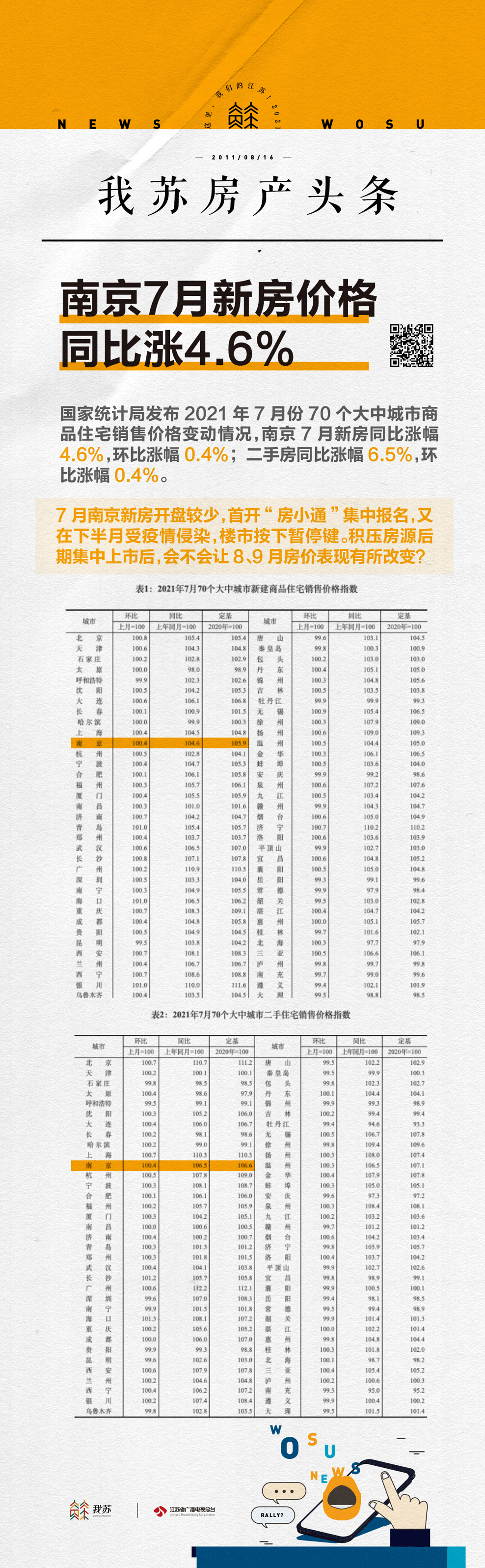刚刚,国家统计局发布《2021年7月份70个大中城市商品住宅销售价格变动情况》。数据显示:2021年7月份,南京新房价格环比上涨0.4%,同比涨4.6%;二手房环比上涨0.4%,同比上涨6.5%。