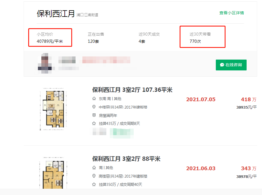目前区域内在售二手房仅有保利西江月,根据某二手房成交数据显示,保利西江月现在均价40789元/㎡,倒挂超1万元/㎡,同时770次的带看量也能看出购房者对研创园板块的认可,板块价值得到市场认可。