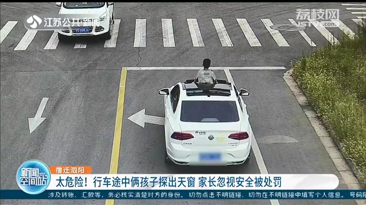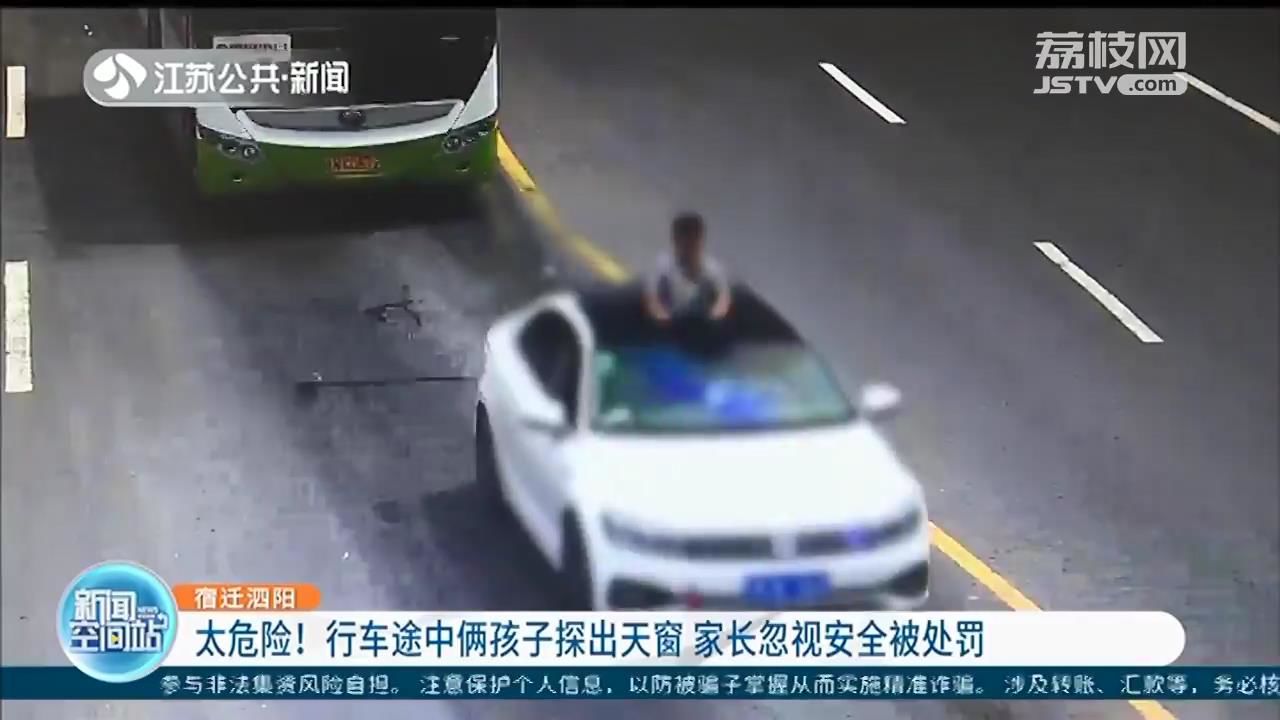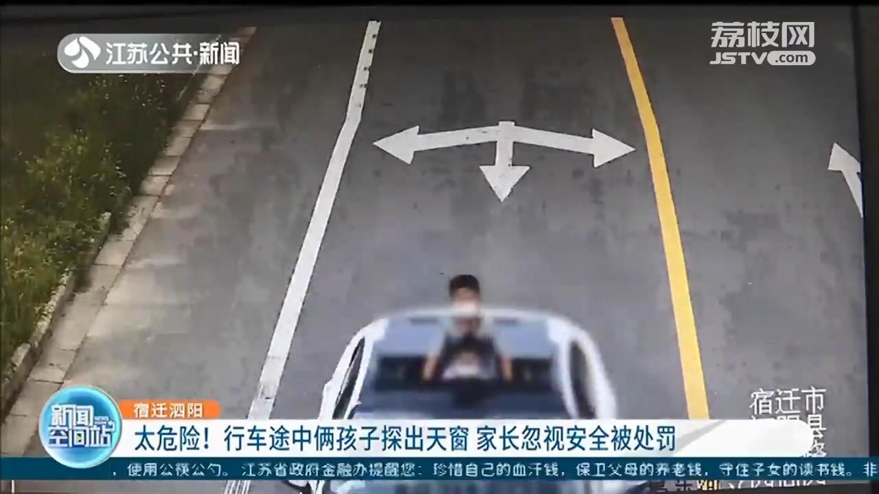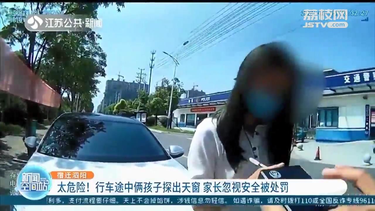 8月24日,宿迁泗阳县公安局交警大队民警在视频巡查中发现,一辆小轿车在行驶途中开着天窗,车上两名儿童将半个身子探出天窗,让人看了心惊胆战。