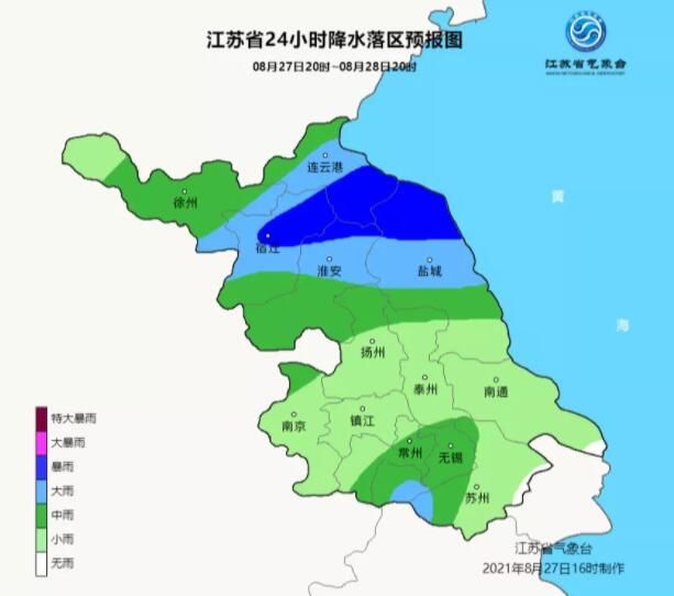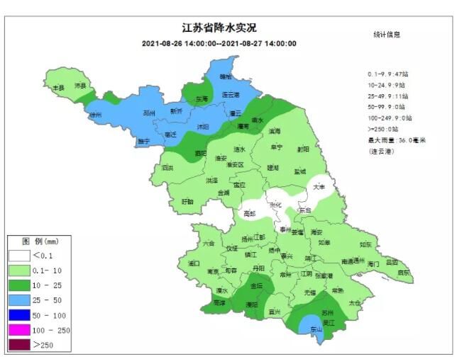 8月26日下午14点到8月27日下午14点,全省大部分地区都有降水,雨量小到中雨,局部大雨,累计最大雨量连云港(36毫米)。