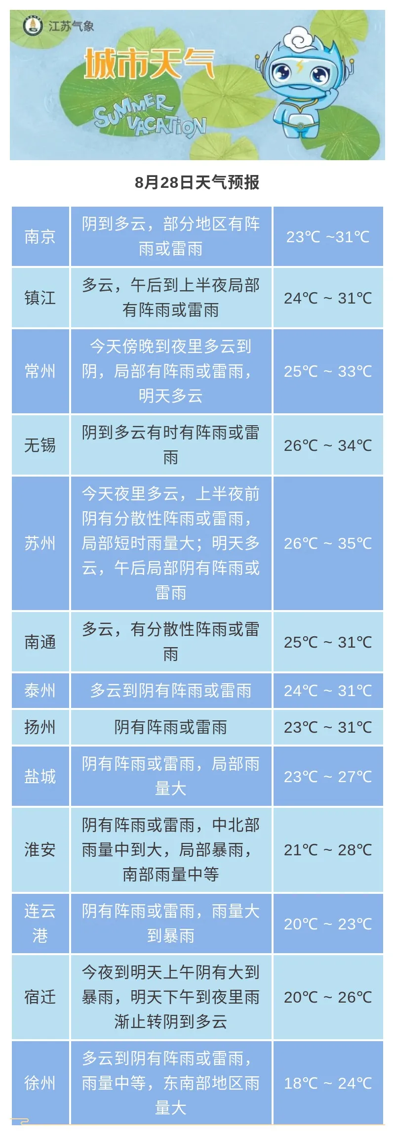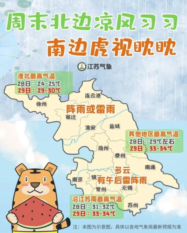 28日(周六)最高温度:淮北地区24~25℃,苏南地区31~32℃;