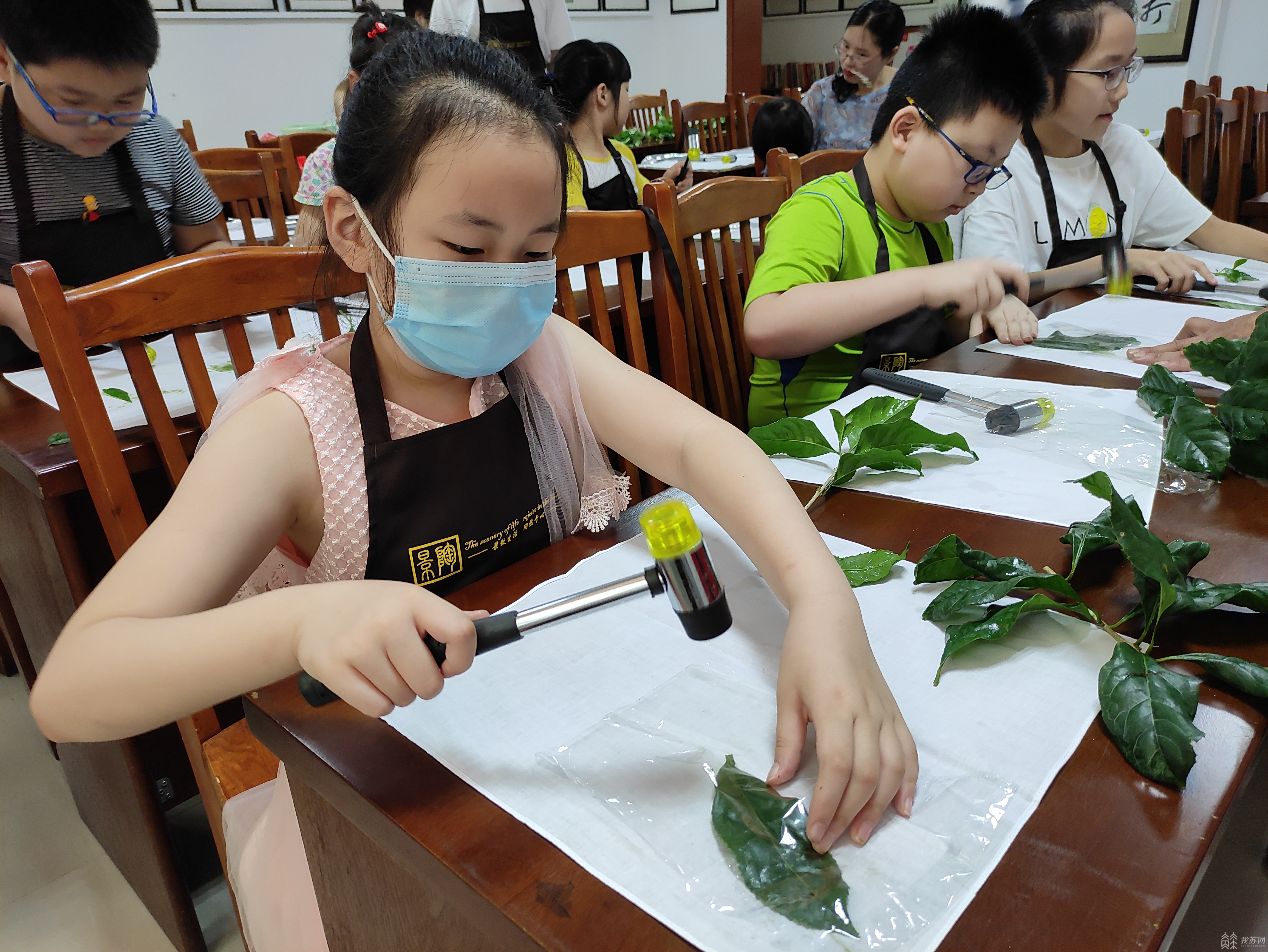 如果说陶艺是孩子们发挥想象力的天堂,那布艺则是他们展示创作力的海洋。“树叶艺画是以树叶为原材料,进行艺术表达的文化形式。”在产山“继创园”非遗文化科普教育基地,非遗传承人陆芳老师一面介绍,一面现场制作“树叶艺画”。只见她手把手教孩子们先用锤头敲击树叶,使其平整、柔软,利用其汁水再进行形状的勾勒,一张张树叶拓印便被“画”了出来。