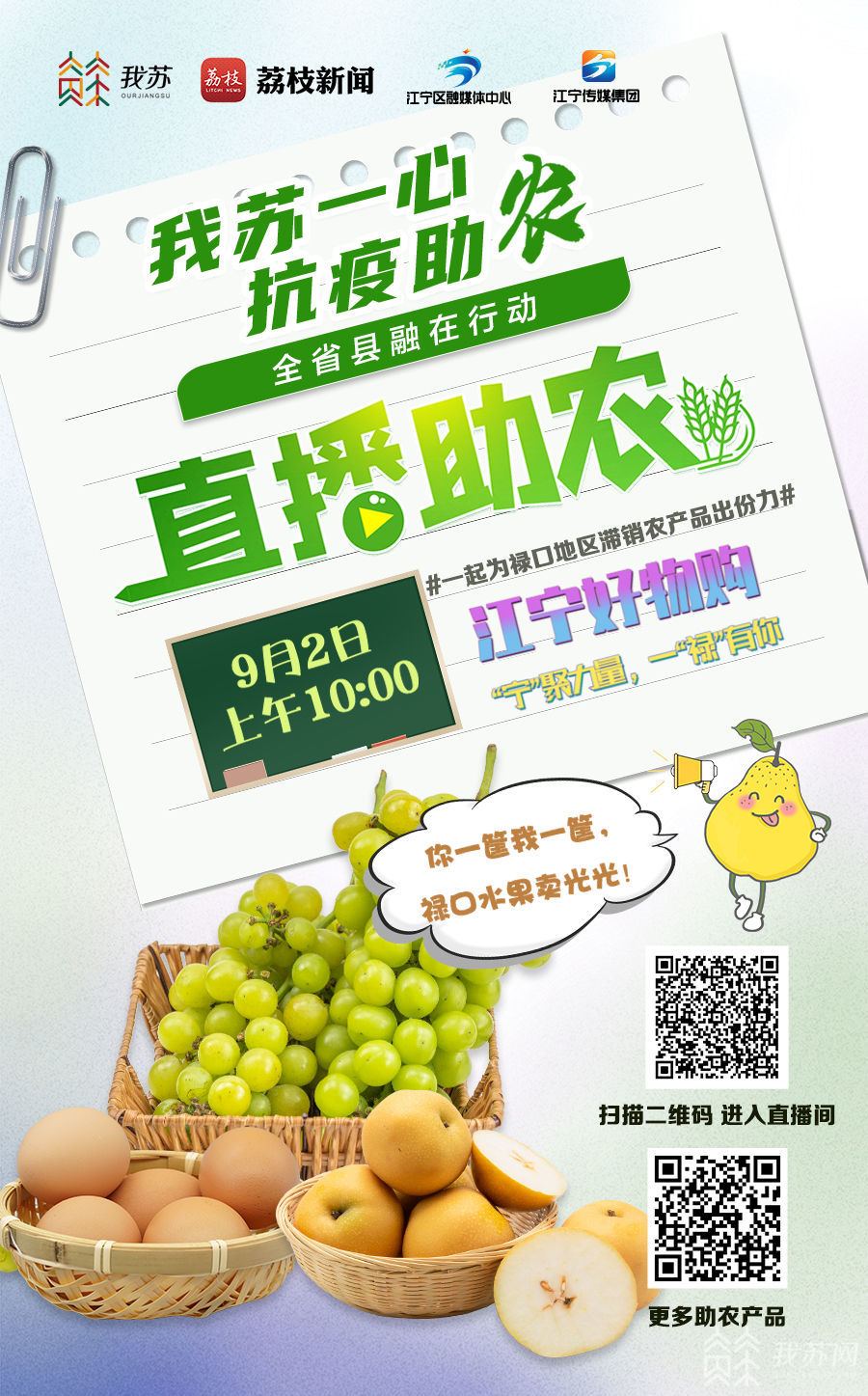 我苏网讯 受疫情影响,原有的销售渠道受阻,江宁禄口农户果蔬出现滞销。江苏广电总台我苏联合全省县级融媒体中心发起公益活动“抗疫助农”,我苏网提供公益资讯平台,由各地提供优质的、因疫情滞销的农产品信息。今天的助农直播间,玲珑剔透的葡萄,鲜红饱满的无花果,脆爽汁多的黄花梨将一一登场,等你来品味。