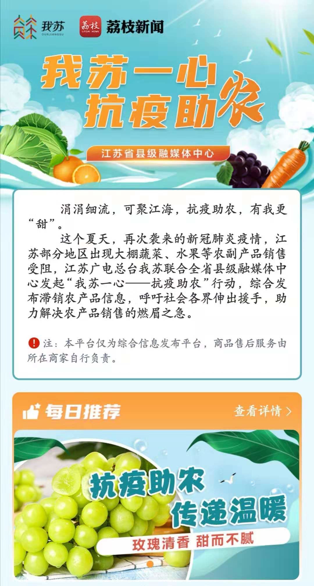 江苏广电总台我苏联合全省县级融媒体中心火速响应!即日发起“我苏一心——抗疫助农”行动,打通助农最后一公里。权威媒体,搭建平台,综合发布滞销农产品信息,呼吁社会各界伸出援手,助力解决农产品销售的燃眉之急。(注:本平台仅为综合信息发布平台,商品售后服务由所在商家自行负责。)