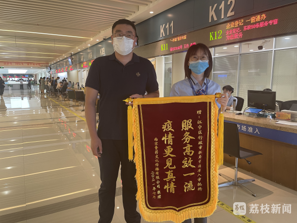 我苏网讯 “服务高效一流,疫情更见真情。”今天(9月3日),南京江宁区行政审批局市场准入审批科收到一面锦旗,感谢窗口人员的“加急”服务。