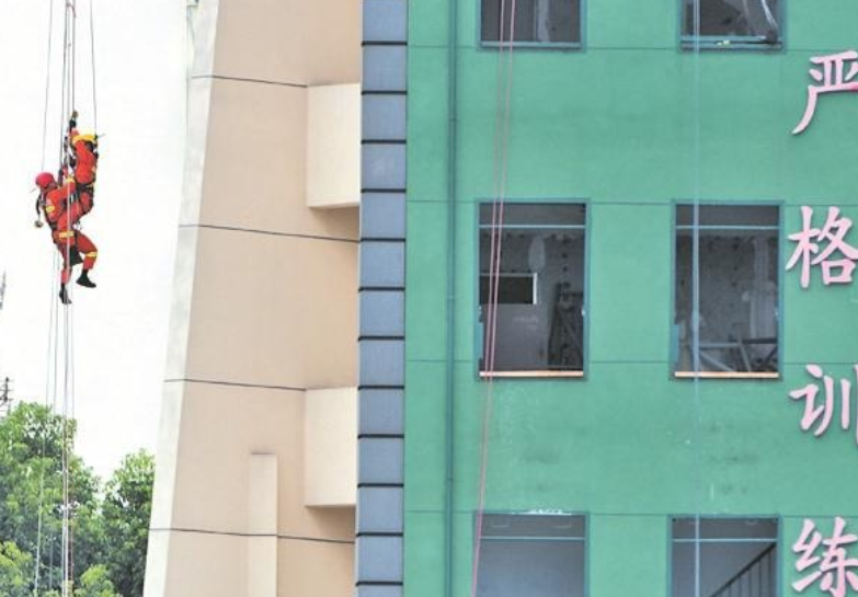 昨天下午,在绳索救援项目中,来自特勤二站的刘熙文率先出战。他不负众望,攀爬出了一个让在场人员连连叫好的成绩。比赛枪响,刘熙文需要快速打5个绳结,接着在旁边挂上7个挂钩,再解下7个挂钩,之后便开始向上攀爬。记者了解到,攀爬的高度大约为30米,但最大的挑战可不仅仅如此,在到达顶端后,他还需要横向跨越10米的距离,这段距离他将无处借力,只能凭借手中的挂锁:“上肢力量差点就基本宣告失败了。”而即使是越过了这段距离,还有一大难关等着他——在半空中,有一名“被困人员”失去了意识,靠着绳索悬挂在半空,刘熙文需要尽快下滑到“被困人员”处并将其带至下方。