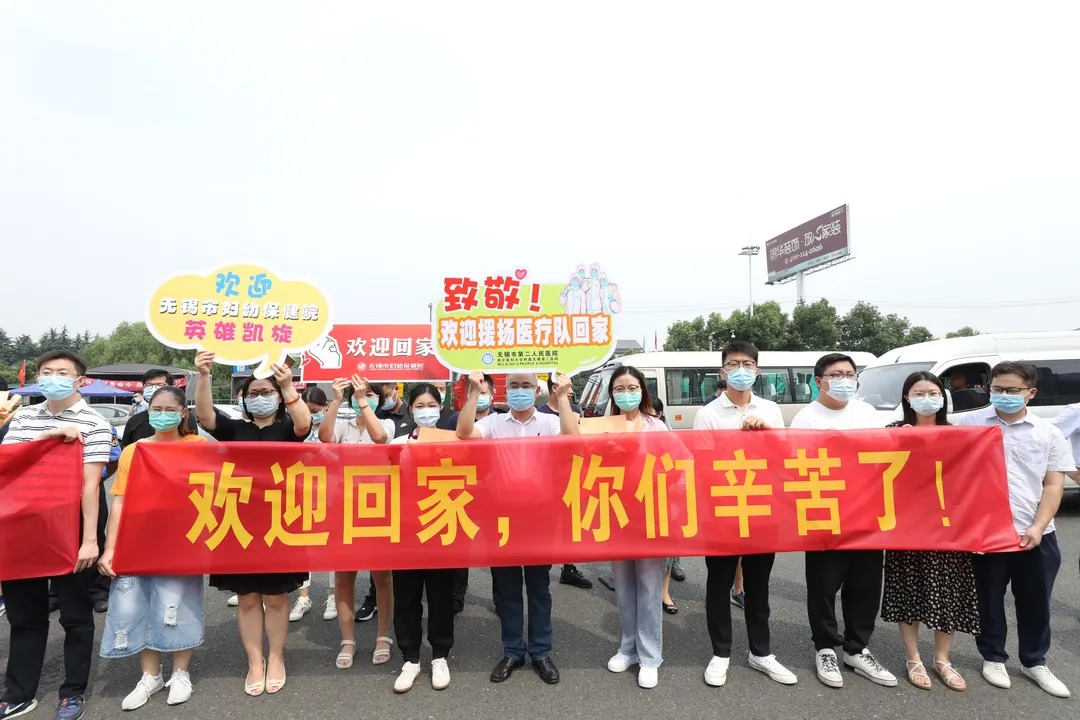 上午10点30分,迎接勇士的人群就已抵达无锡东出入口,他们手捧鲜花,举着“致敬白衣天使”的牌子,拉着“热烈欢迎无锡援扬医疗队凯旋”的横幅,静候赴扬队员们归来。天气闷热,但高温阻挡不了人们的热情。终于,在看到第一辆载有援扬勇士的大巴车时,人群沸腾了,大家远远地朝着大巴车挥手欢呼。车上的医疗队员也纷纷回应致意,不少队员拿出手机记录这一特殊时刻。