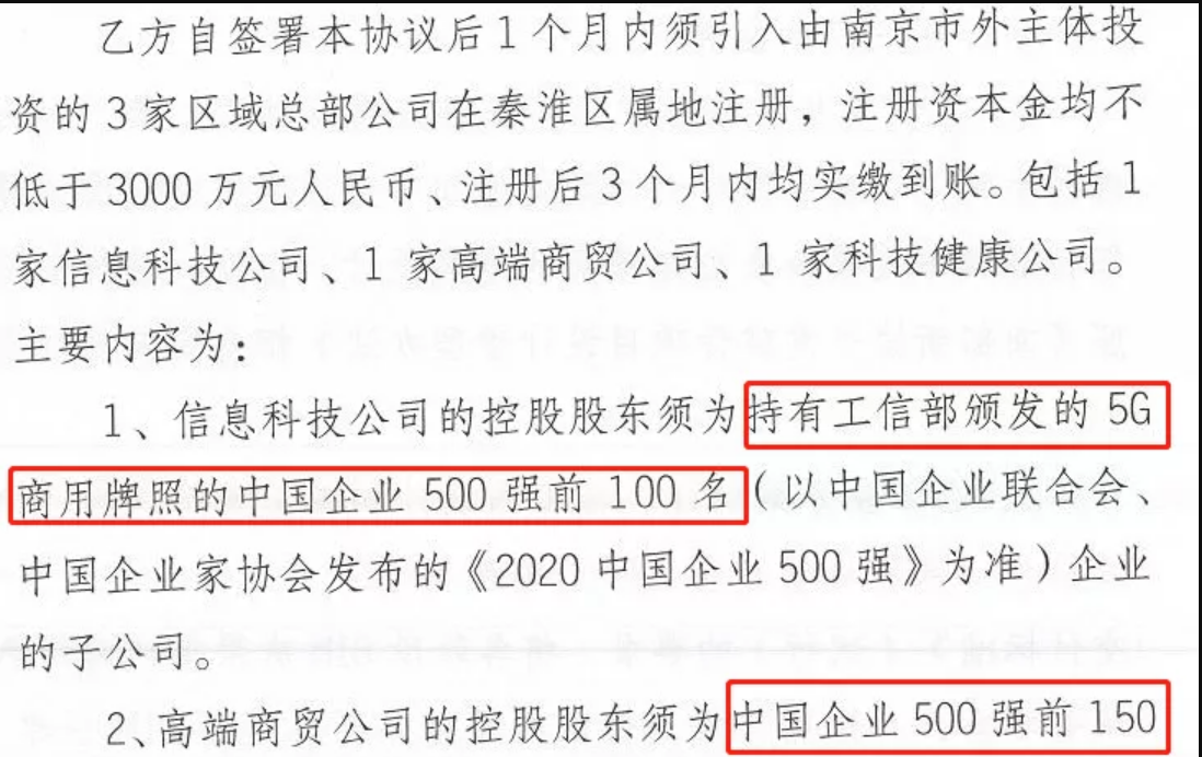 该地块出让条件中明确规定:需引进3家区域总部公司在秦淮区属地注册,分别为:信息科技公司、高端商贸公司以及科技健康公司,并且对于公司的要求也非常严格,具体如下: