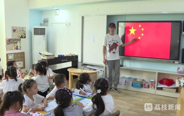 9月7日上午,响水县幼儿园大(三)班幼儿教师张树峰正利用多媒体为孩子们讲解国旗的内涵和意义,孩子们听得认真,神情专注,并在老师的带领下进行绘画。