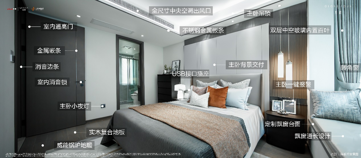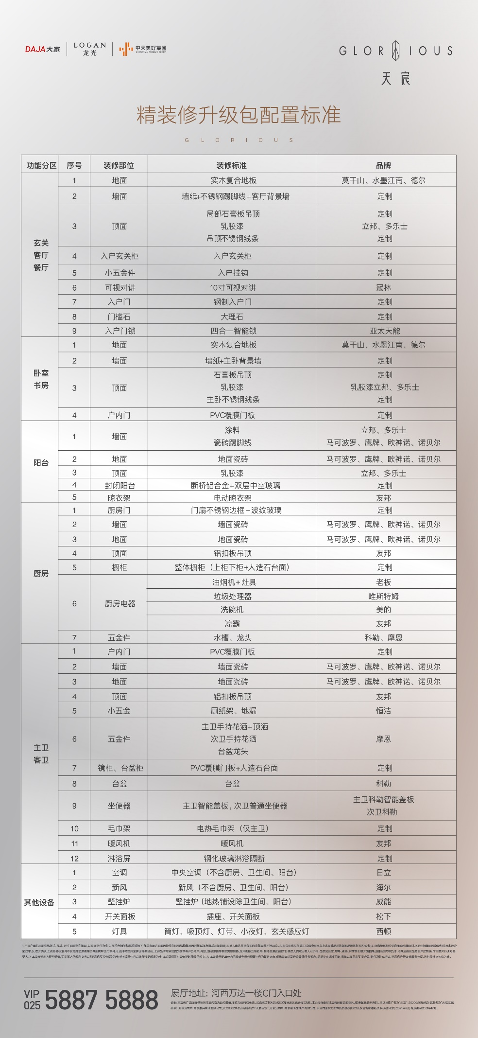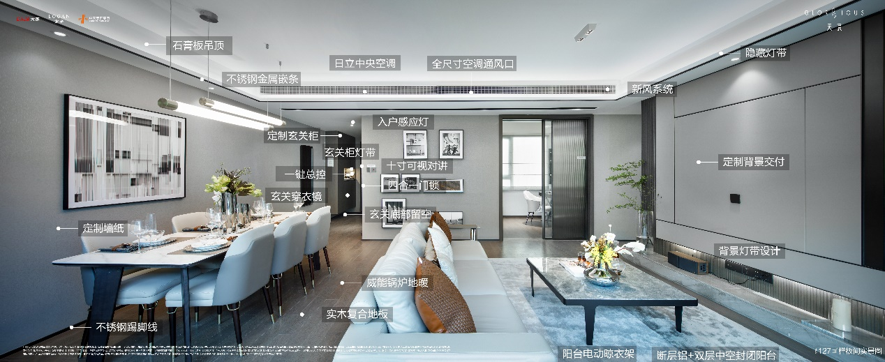 从升级精装标准上来看,选用的皆是国际一线和国内知名品牌,配置了日立中央空调、威能锅炉地暖、海尔新风三大件。