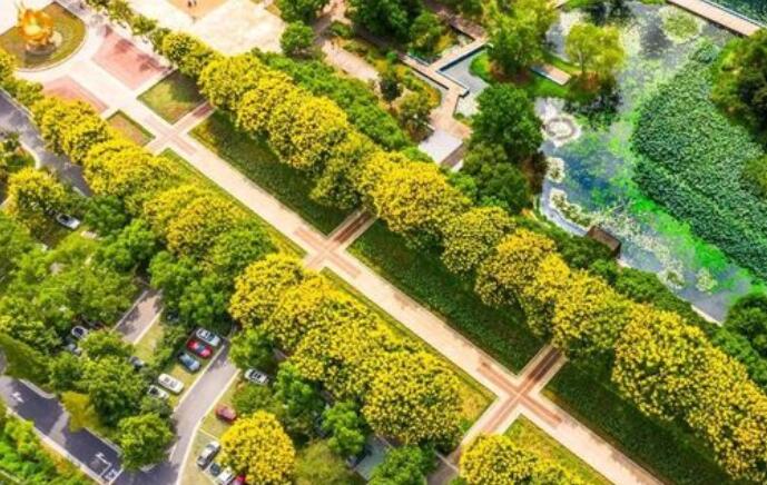 九月初,南京玄武湖景区内,情侣园花卉大道两侧,栾树率先带来秋的味道。高大、绿色的树木枝头,金黄色的花朵簇拥在一起,形成黄绿分明的景观。从空中望去,好像一条黄金大道。栾树树荫下,成片的醉蝶花从夏天开放至秋天,汇集成粉紫色的花海。