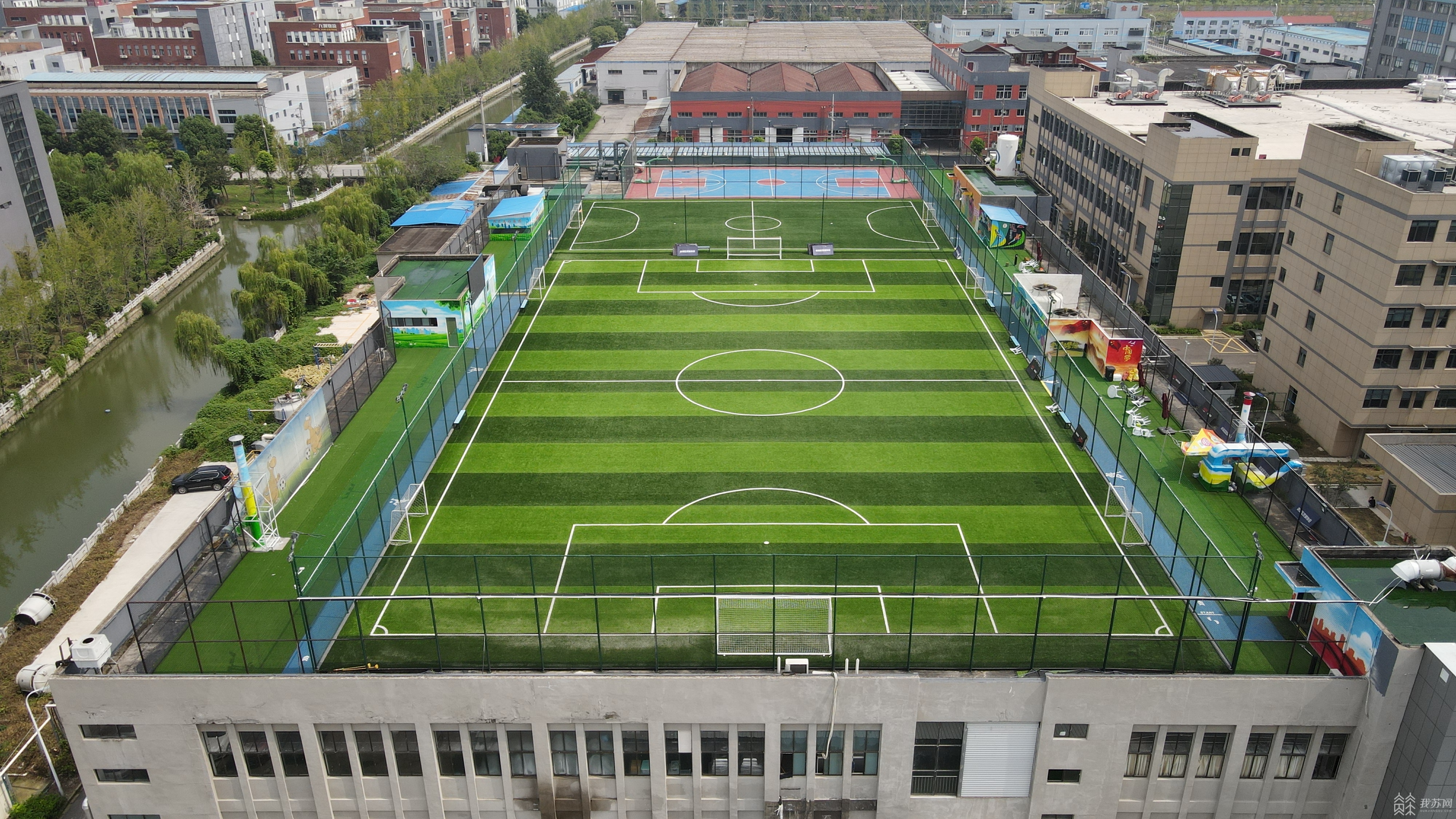 红蓝相间的塑胶篮球场、人工草坪铺设的绿茵足球场,几座漂亮的彩绘“小屋”,四周摆放着白色的休闲椅……登上无锡光电新材料科技园内一处厂房的楼顶,映入眼帘的便是一个刚刚投入使用的超级“空中运动场”,这也是无锡市梁溪区首个楼顶运动场。如今这是已经是该园区的企职工和周边居民群众运动健身的好地方。