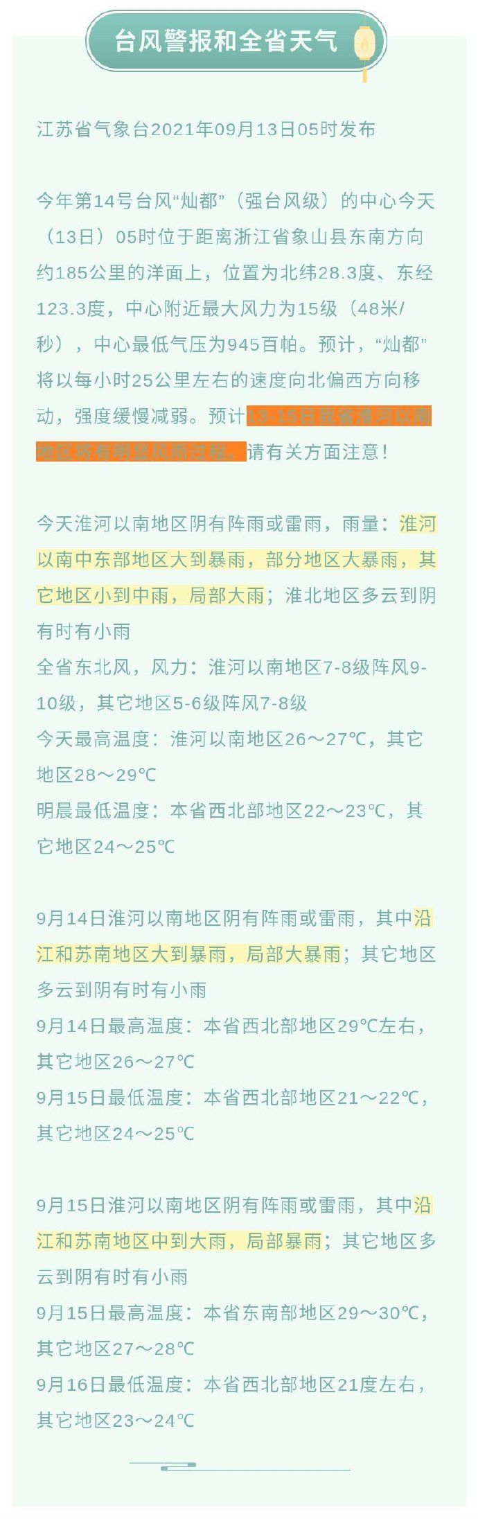 今年第14号台风“灿都”(强台风级)的中心今天(13日)05时位于距离浙江省象山县东南方向约185公里的洋面上。预计,“灿都”将以每小时25公里左右的速度向北偏西方向移动,强度缓慢减弱。预计13-15日我省淮河以南地区将有明显风雨过程。请有关方面注意!