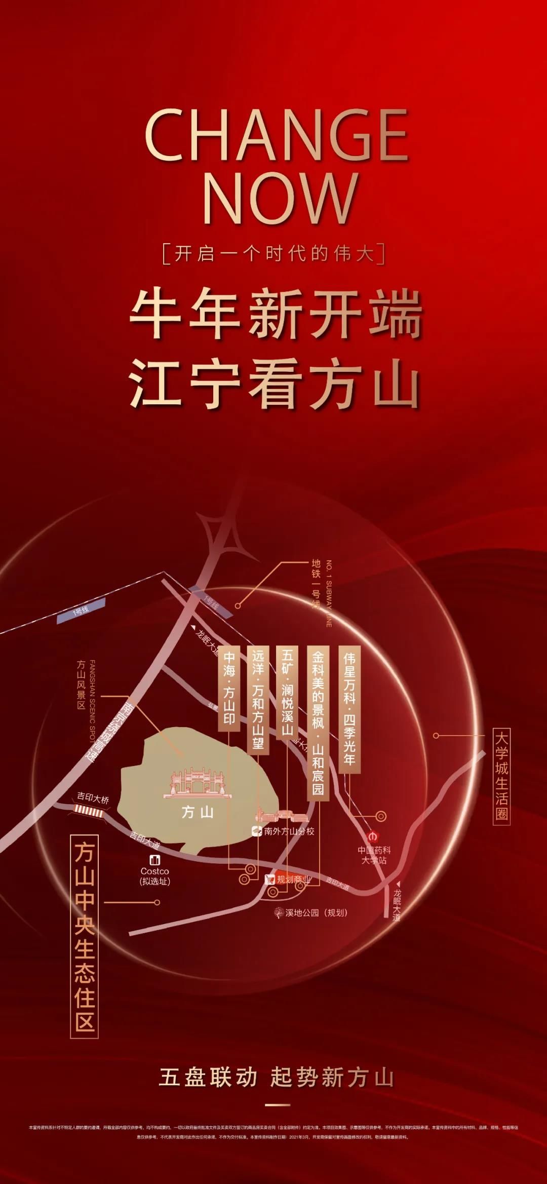 就在今年3月初,许多南京人的朋友圈都被一张红色海报刷屏,Change Now,开启一个时代的伟大,“牛年新开端,江宁看方山”,这便是这5个项目隶属的5家开发商在刷同一张海报,宣称在新方山见证新时代的崛起。