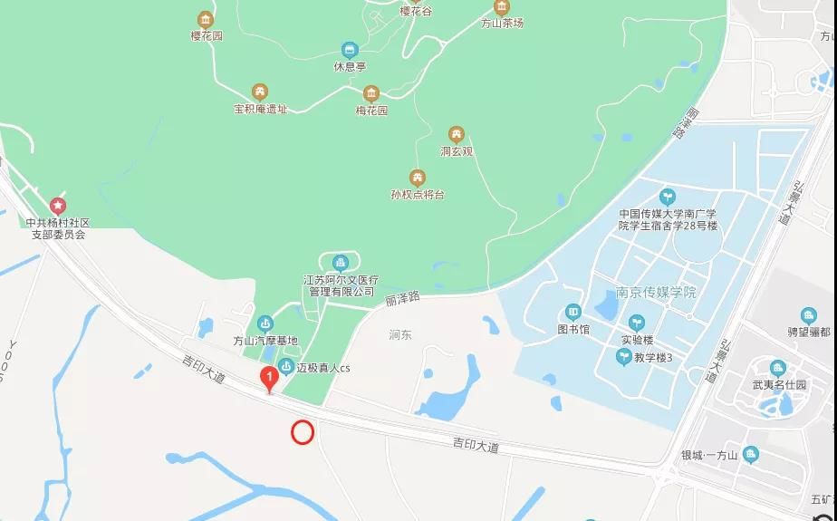 即下图中的圆圈所标注的位置。以地图右上方“中国传媒大学南广学院”的位置作为参考,可以更快找到对应方位。(绿色区域为方山)