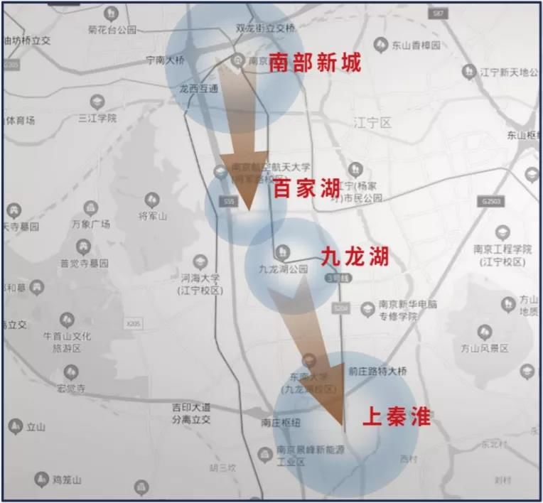 换而言之,江宁已经在未雨绸缪,先期为这些板块的后续开发而造势,毕竟随着百家湖、东山、九龙湖及上秦淮等板块的开发殆尽,江宁急需下一个发展的重点,这时上述区域便成为下一步的发展重心。