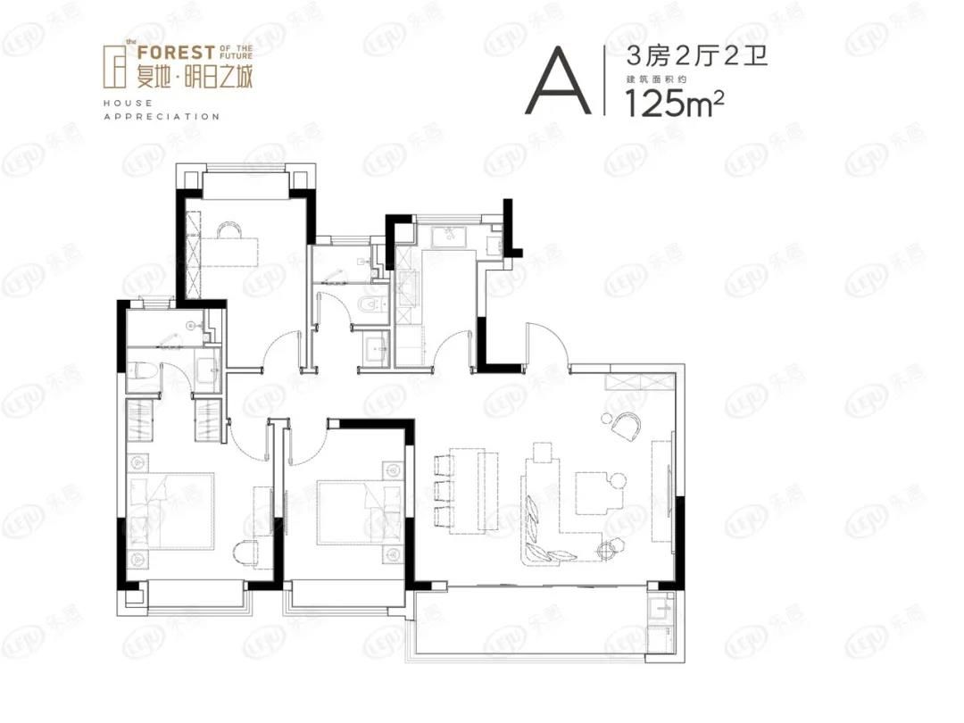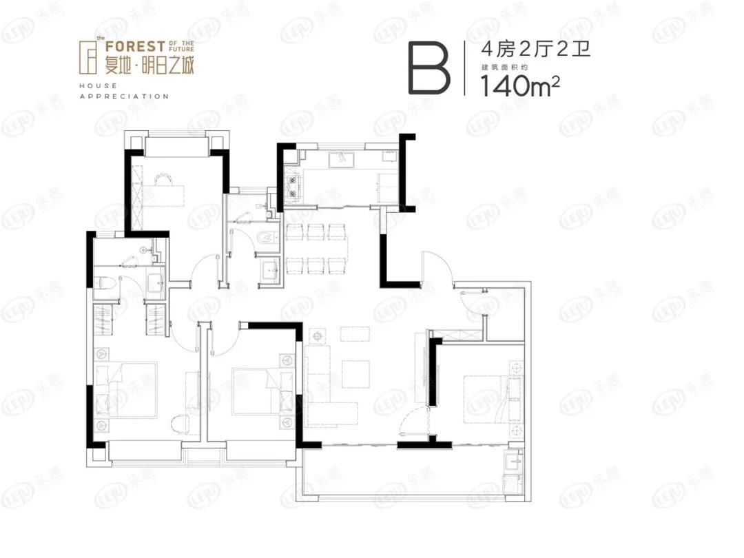 复地明日之城住宅共计打造9栋12-26F高层住宅,户型面积约125㎡、140㎡、169㎡。
