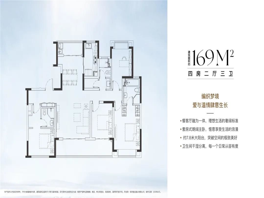 169㎡4房2厅3卫,四开间朝南,双套房设计,南北三阳台,三个房间都有大飘窗,另外还带有一个储藏间。
