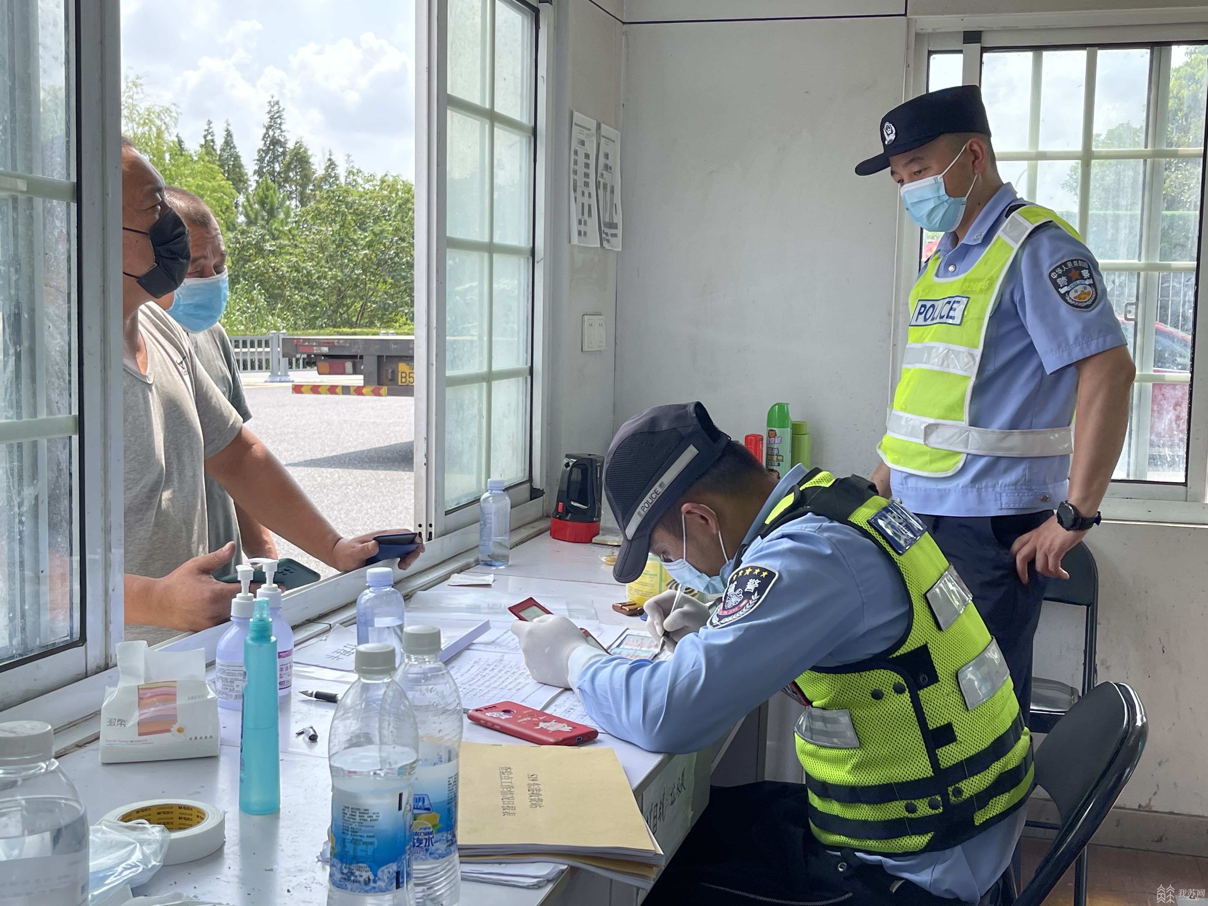 “师傅你好,请出示您的苏康码,扫一扫行程码。”烈日下,来自锡山交警大队七中队的民警在仔细查验一辆过往大货车司机的相关资料,引导进入车辆有序登记,查验健康码、行程码、核酸检测等证明,在仔细查验过程中始终做到有序,尽量避免车辆积压。