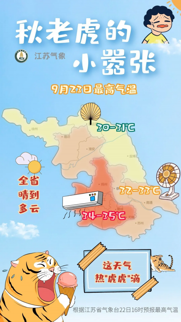 据我苏网 今天全省晴到多云,今晨沿淮淮北局部地区有雾或浓雾,全省偏东风4级左右,今天最高温度:本省东北部地区30℃左右,淮河以南西部地区34~35℃,其它地区32~33℃,明晨最低温度:全省23℃左右。 详情>>
