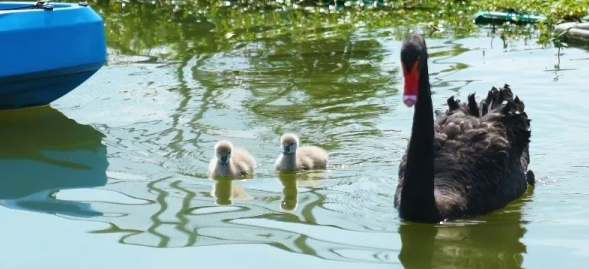 新出生的小黑天鹅一身灰黑色的毛发,圆圆的小脑袋,配上两只小小的黑脚丫,看起来丑萌丑萌的。当游船靠近时,它们也好奇地贴近围挡,探索着这个全新的世界。