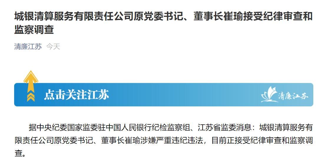 据中央纪委国家监委驻中国人民银行纪检监察组、江苏省监委消息:城银清算服务有限责任公司原党委书记、董事长崔瑜涉嫌严重违纪违法,目前正接受纪律审查和监察调查。