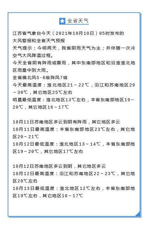 据江苏省气象台,今天(10月10日)全省阴有阵雨或雷雨,其中东南部地区和沿淮淮北地区雨量中到大雨。全省偏北风5-6级阵风7级,今天最高温度:淮北地区21~22℃,沿江和苏南地区29~30℃,其它地区25℃左右,明晨最低温度:淮北地区13℃左右,本省东南部地区19~20℃,其它地区16~17℃。