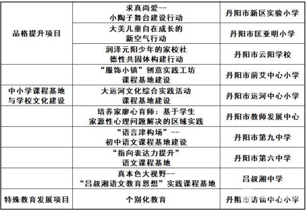 今年,丹阳市有3个江苏省中小学生品格提升项目、7个江苏省中小学课程基地与学校文化建设项目,1个特殊教育发展项目,共计11个省级内涵建设项目省级立项实施。