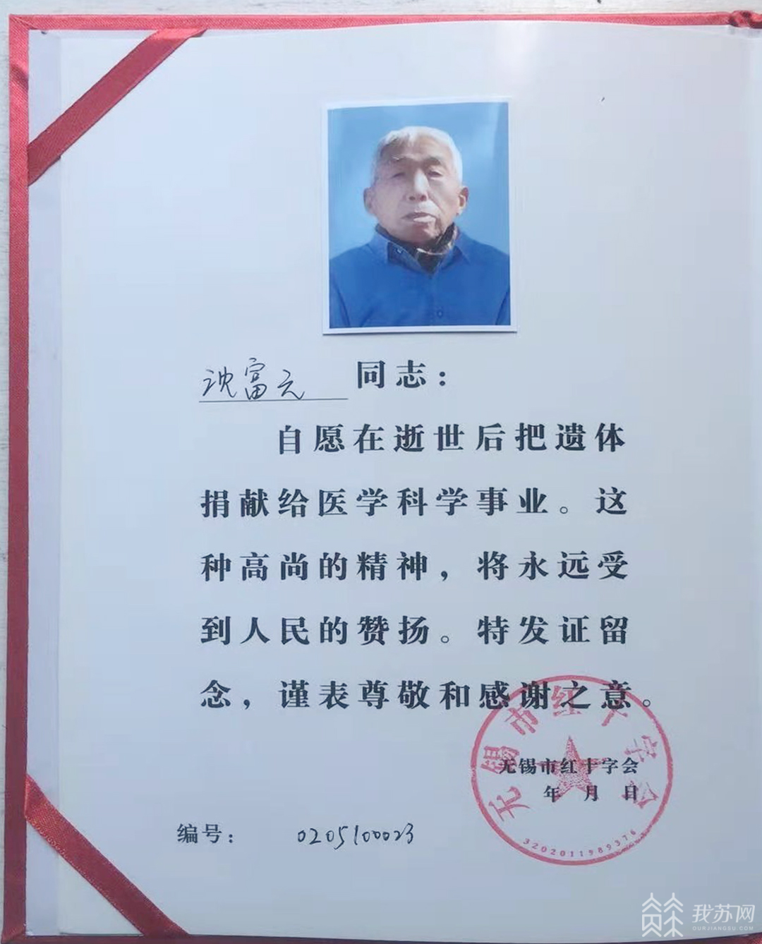 “我已经病卧在床40多天,我希望在我走后,能捐献遗体给医学院,身后事一切从简……”无锡市锡山区东港镇今年80岁的退休老党员、退伍军人沈富元老人委托儿子联系当地的红十字会,留下将遗体捐献的临终嘱托。