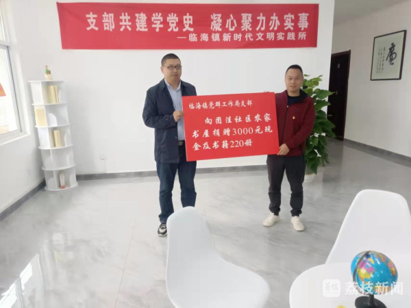 与会人员共同参与团洼社区农家书屋启动仪式,陈洪飞代表临海镇党群工作局支部向团洼社区农家书屋捐赠3000元现金和220册图书。