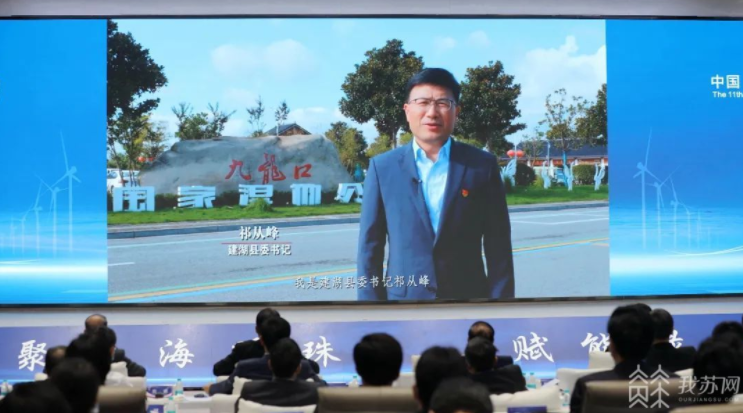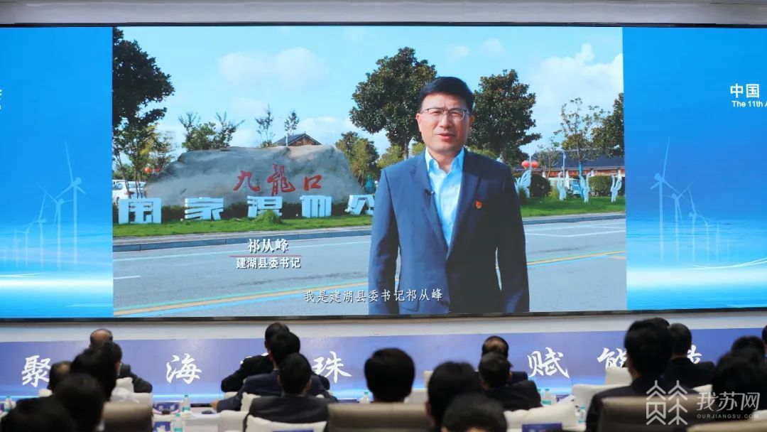 ▲中国·盐城第十一届沿海发展人才峰会上,县委书记祁从峰视频推介建湖引才环境