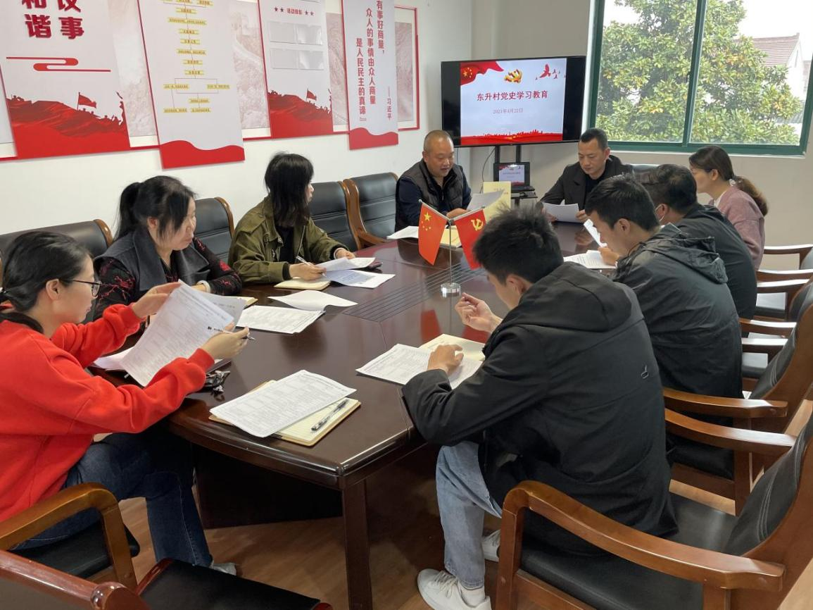 东升村紧紧围绕“学党史、悟思想、办实事、开新局”的目标要求,成立党史学习教育工作领导小组,制定工作方案,由党总支书记领学党史书籍,把握计划安排节点,务实际、下实功、求实效,把“实”字贯穿党史学习教育始终,坚持用党的最新理论成果武装头脑、坚定理想信念、明确政治方向,通过党史学习教育,做到学史明理、学史增信、学史崇德、学史力行,不断增强“四个意识”、坚定“四个自信”、做到“两个维护”。