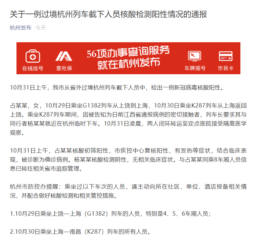 杭州市防控办提醒:乘坐过以下车次的人员,请主动向所在社区、单位、酒店报备相关情况,并配合做好核酸检测和相关管控措施。