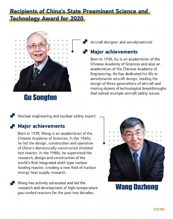 Aircraft designer Gu Songfen and nuclear expert Wang Dazhong were awarded the State Preeminent Science and Technology Award, China's top science honor, on Wednesday.