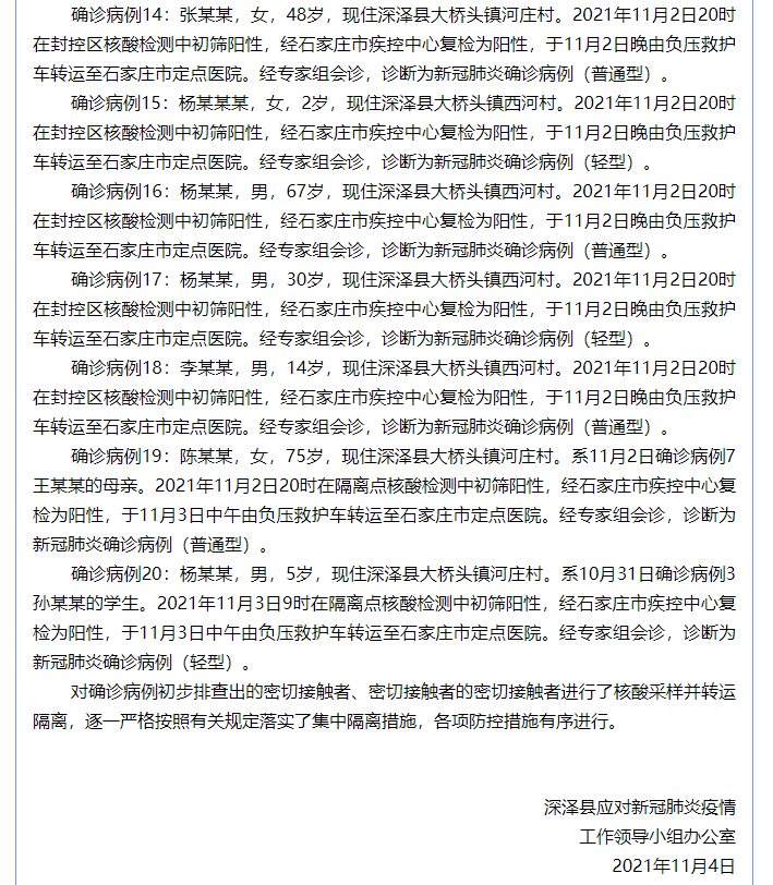 确诊病例20:杨某某,男,5岁,现住深泽县大桥头镇河庄村。系10月31日确诊病例3孙某某的学生。2021年11月3日9时在隔离点核酸检测中初筛阳性,经石家庄市疾控中心复检为阳性,于11月3日中午由负压救护车转运至石家庄市定点医院。经专家组会诊,诊断为新冠肺炎确诊病例(轻型)。