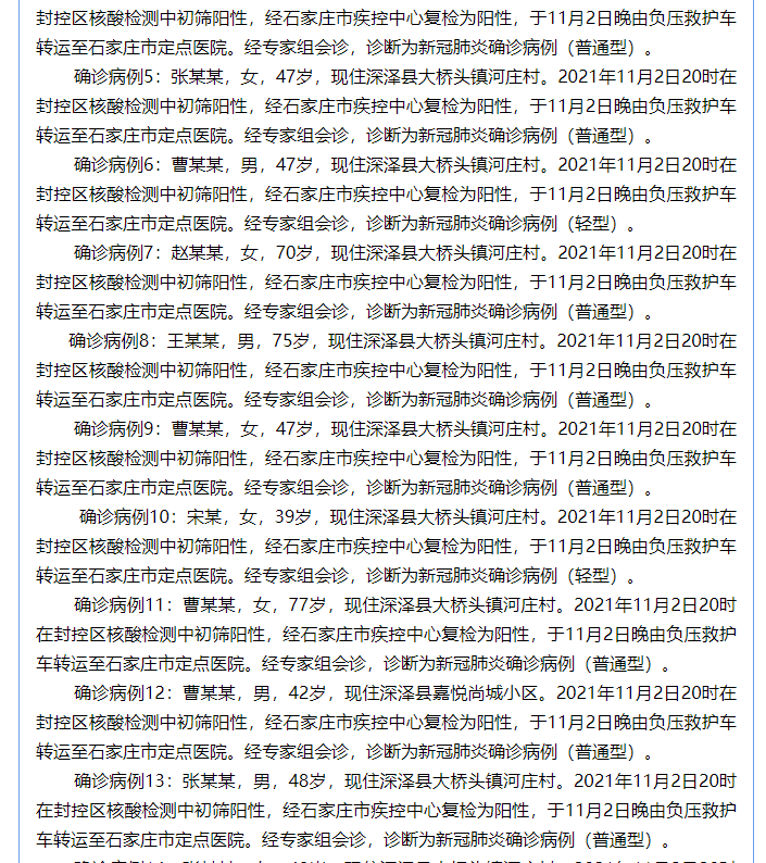 确诊病例11:曹某某,女,77岁,现住深泽县大桥头镇河庄村。2021年11月2日20时在封控区核酸检测中初筛阳性,经石家庄市疾控中心复检为阳性,于11月2日晚由负压救护车转运至石家庄市定点医院。经专家组会诊,诊断为新冠肺炎确诊病例(普通型)。