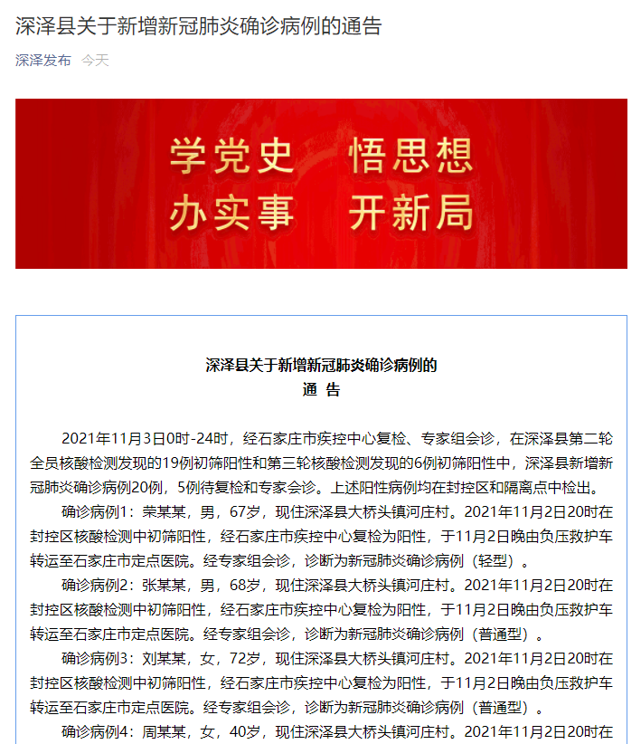 确诊病例6:曹某某,男,47岁,现住深泽县大桥头镇河庄村。2021年11月2日20时在封控区核酸检测中初筛阳性,经石家庄市疾控中心复检为阳性,于11月2日晚由负压救护车转运至石家庄市定点医院。经专家组会诊,诊断为新冠肺炎确诊病例(轻型)。