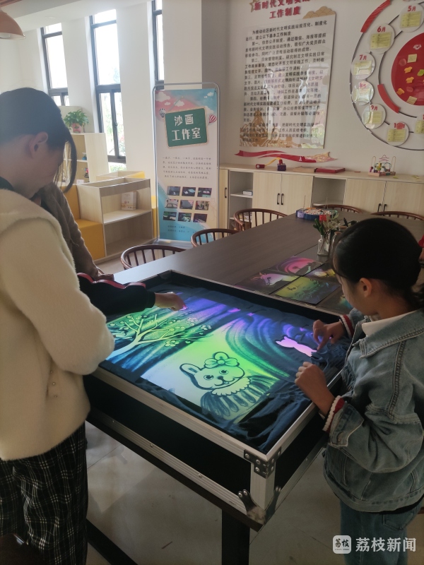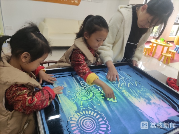 我苏网讯 “小朋友们,像我一样,先把沙子均匀地撒在画台上,然后伸出食指这样画一下……”11月4日,在宿迁市宿豫区曹集乡集西雅苑小区,20多名儿童围在沙画老师面前,一边听着老师的讲解,一边动手制作沙画。