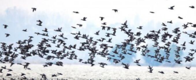 11月4日,泗洪县洪泽湖湿地国家级自然保护区迎来大批候鸟,数万只野鸭、白骨顶鸡等时而在空中盘旋,时而在水上觅食、嬉戏,场面蔚为壮观。近年来,随着当地生态环境不断修复与改善,鸟类数量逐年增多,鸟类种群数也增加至206种。(张连华 摄)