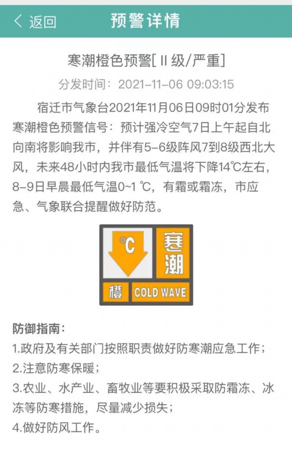 昨天,宿迁市气象台还发布寒潮橙色预警 ▼