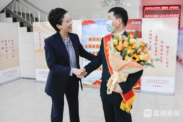 11月7日下午,第八届全国道德模范提名奖获得者马善民返回连云港,连云港市委常委、宣传部部长赵云燕向马善民送上鲜花,代表连云港市委、市政府表示热烈祝贺和崇高敬意。