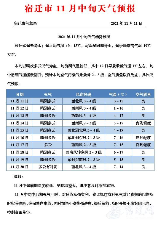 对此,宿迁市气象部门提醒,11月中旬前期气温较低,早晚温差大,请注意及时添加衣物。11月中旬中后期天气回暖,对秋收秋播有利。建议抓住有利天气对已成熟作物及时收获晾晒,确保丰产丰收,同时加快小麦抢播进度,播后苗前,及时开展土壤封闭化除,控制麦田草害。