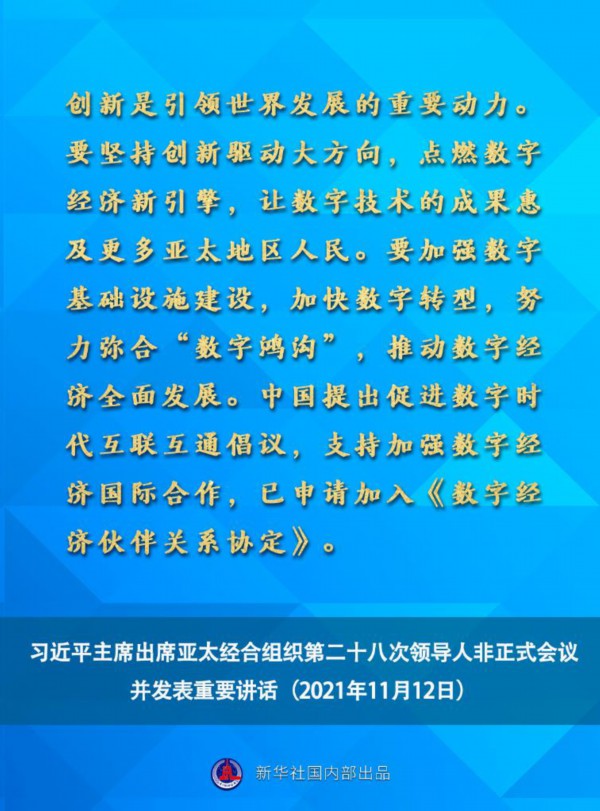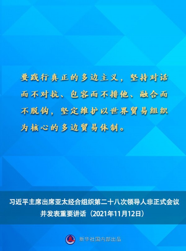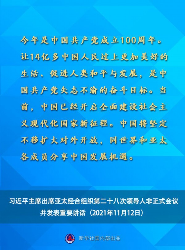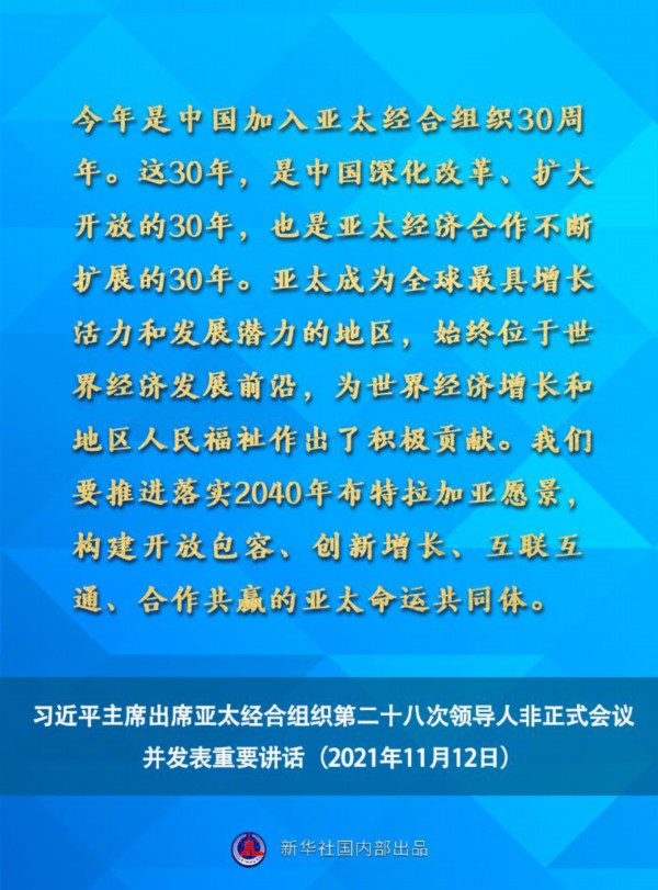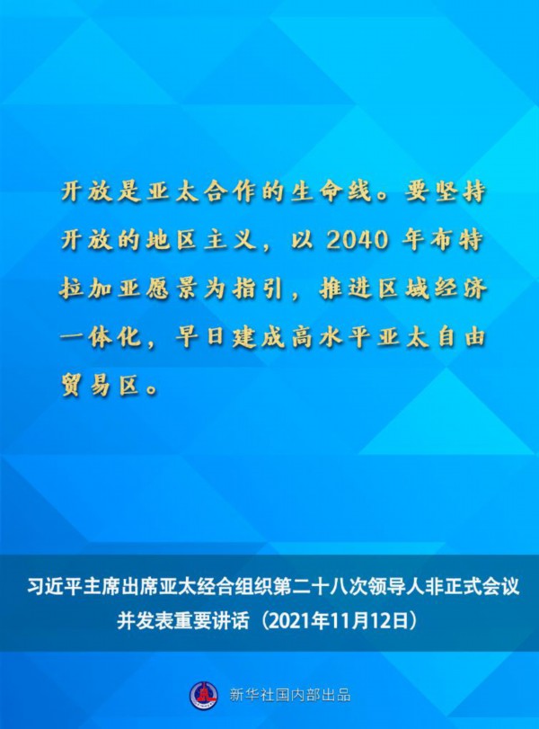 国家主席习近平11月12日晚在北京以视频方式出席亚太经合组织第二十八次领导人非正式会议并发表重要讲话。一起来看讲话要点。