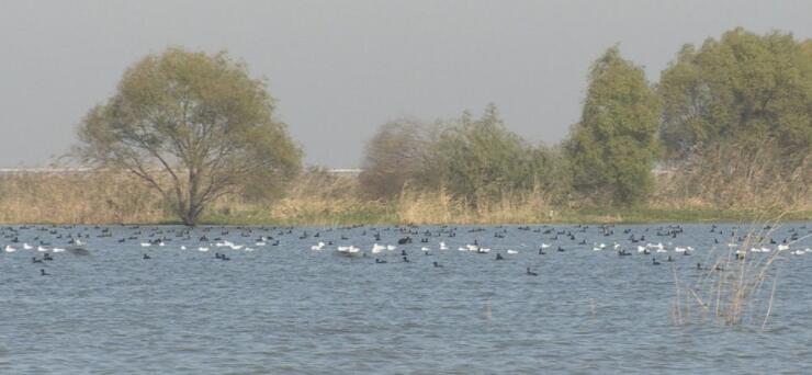 据保护区工作人员观测,这批候鸟已经达到十万余只,是近几年来白骨顶和红嘴鸥前来该保护区最多的一次。